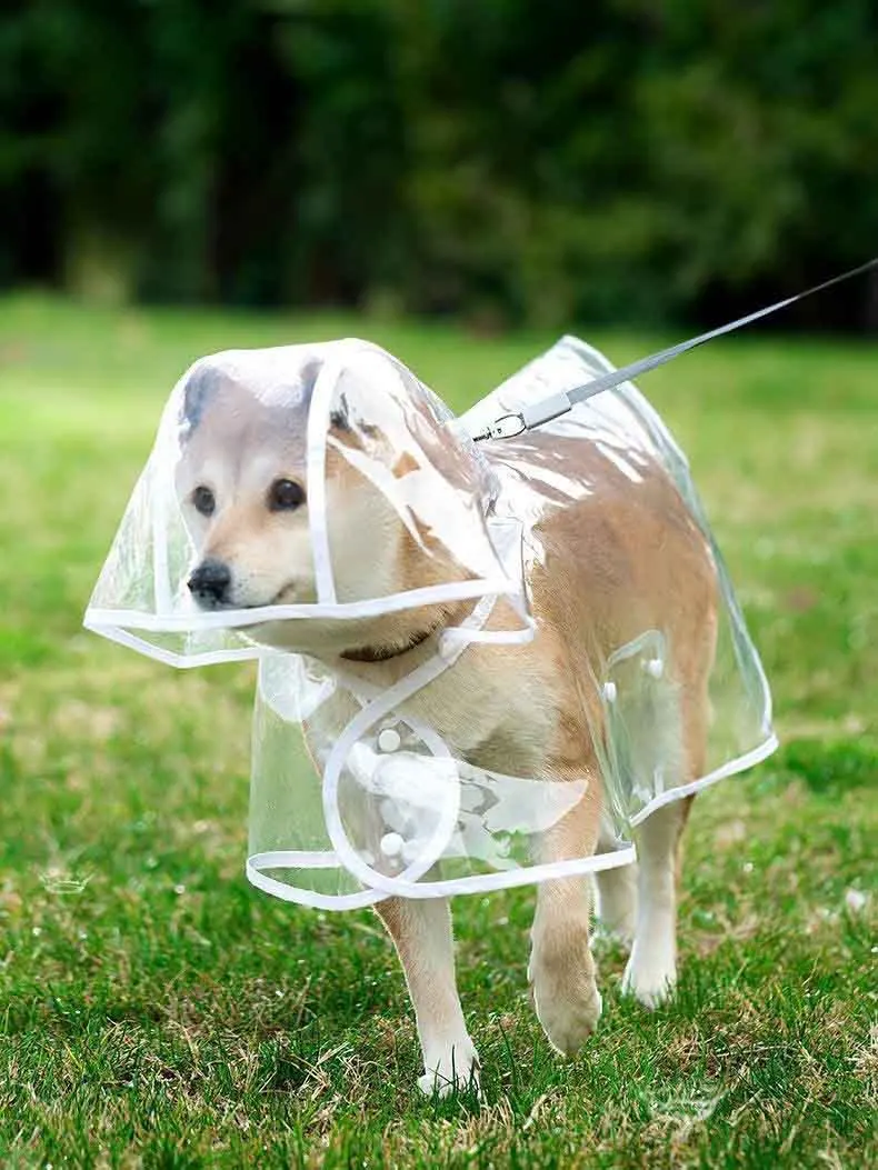 מעיל גשם שקוף ואיכותי לכלבים, כולל כובע מובנה להגנה מקסימלית מפני גשם ורוח.