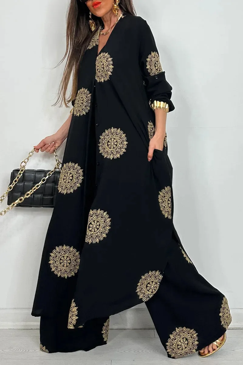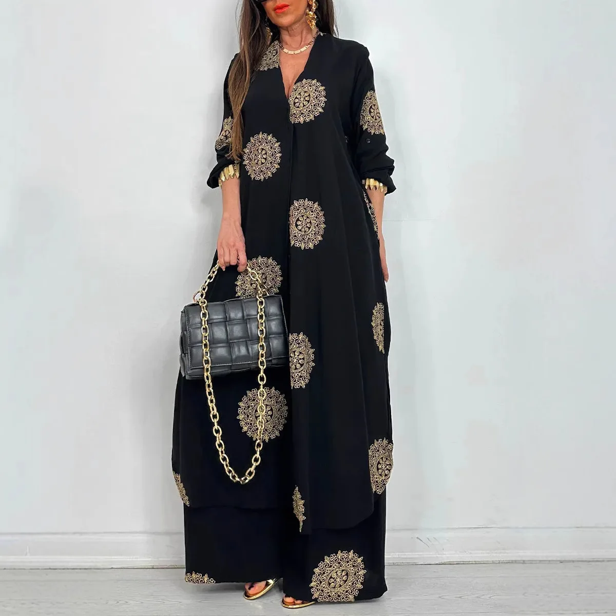 סט 2 חלקים בוהו שיק, עליונית בלוזון מודפסת וינטאג’ ארוכה אובר סייז לנשים, ומכנסיים רחבים מותן גבוה, אלסטי במותניים, בד ללא גמישות