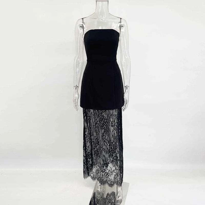 סט שמלת תחרה סטרפלס לנשים אלגנטיות, חצאית ארוכה תחרה עם חגורה גבוהה, סט שני חלקים למסיבות ואירועים