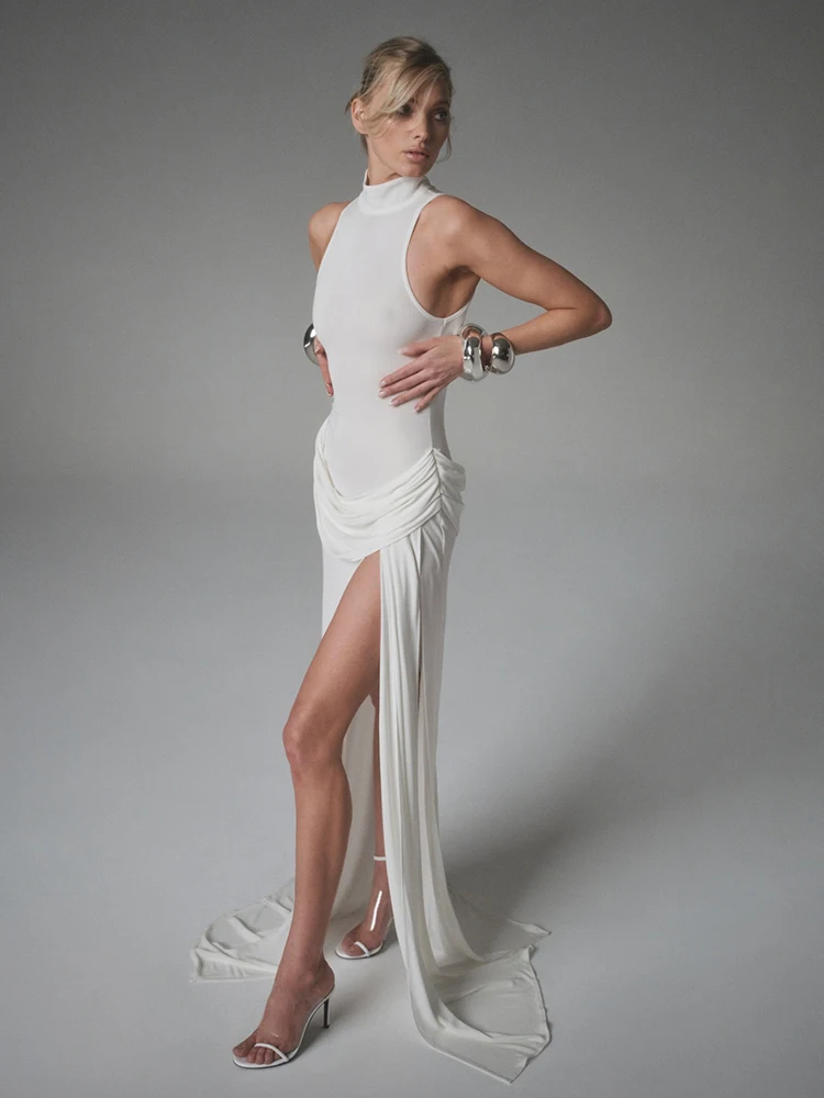 שמלת מקסי עם צווארון גבוה קולר, כתפיים חשופות, שסע בירך במותן גבוה לנשים, אופנה אלגנטית לאירוע